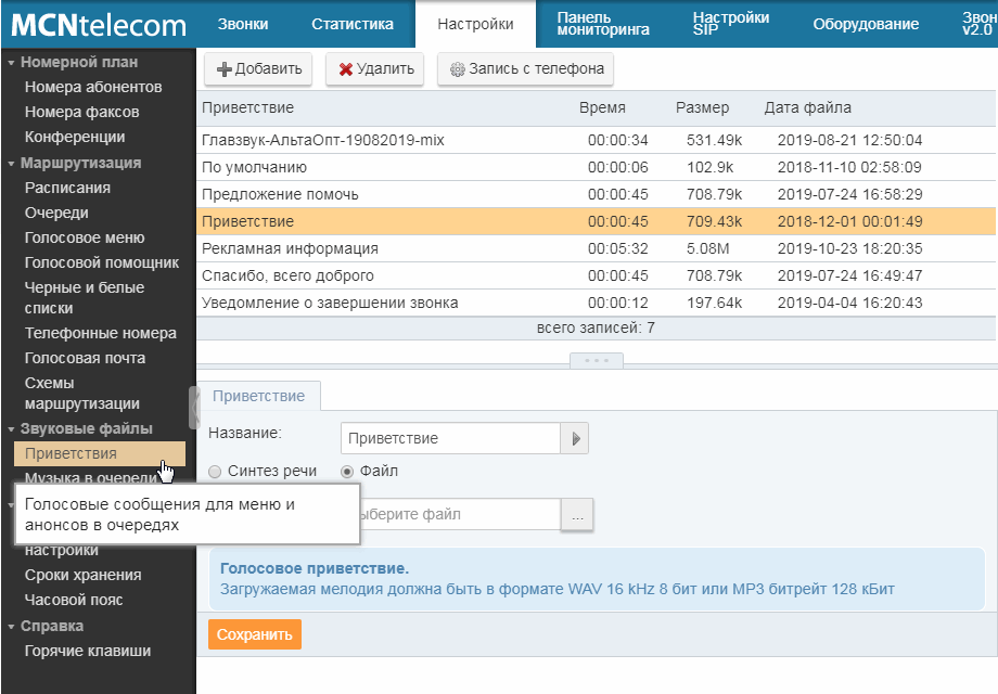 По умолчанию в системе уже содержится записанный файл с голосовым приветствием. Его можно использовать при настройке голосового меню или загрузить свое приветствие и другие сообщения.