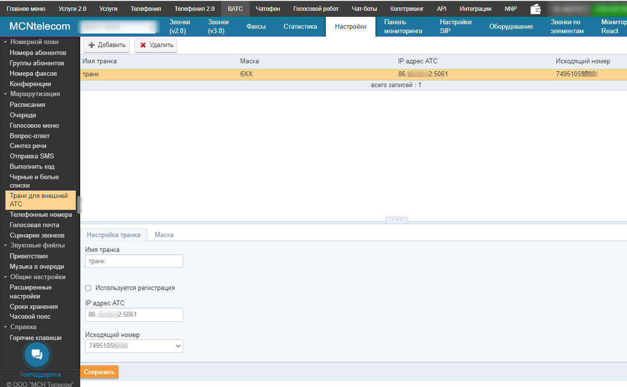 Функция объединения сторонней АТС (как аналоговой, гибридной, так и виртуальной) и Виртуальной АТС